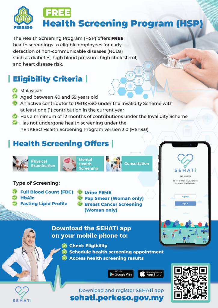 Under the SEHATi Perkeso initiative, the Health Screening Program (HSP) offers FREE health screenings to eligible employees for early detection of non-communicable diseases (NCDs) such as diabetes, high blood pressure, high cholesterol, and heart disease. Check your eligibilities and come get your Free Health Screening at Klinik Amal & Surgeri Port Dickson
